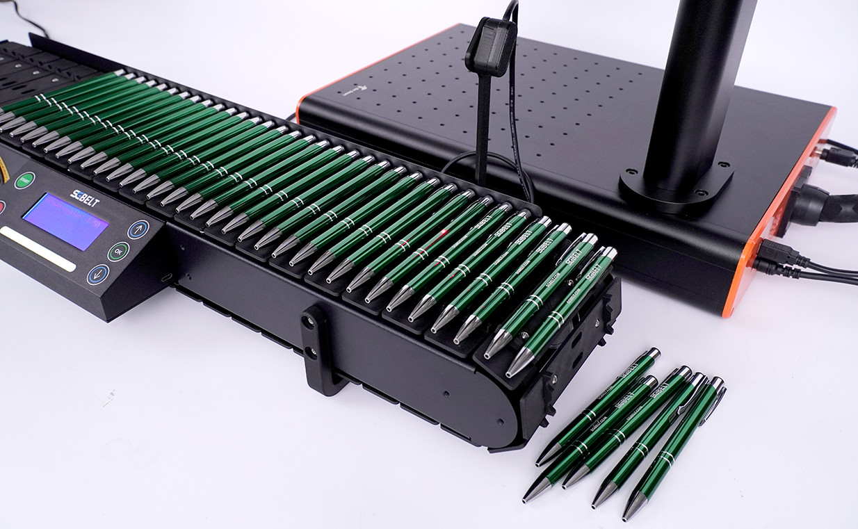 Regardless of the range offered, we always recommend an useful socket for marking aluminium pens of different diameters. This constantly popular assortment ensures that even small production batches that are processed with the right frequency can be profitable. For companies that want to specialize in such marking, it is best to use a laser marking device with a conveyor on a permanent basis, then we can realize multi-thousand batches. It is then easier to prepare designs, keep the relevant settings and change only the color of the pens placed on the conveyor.
