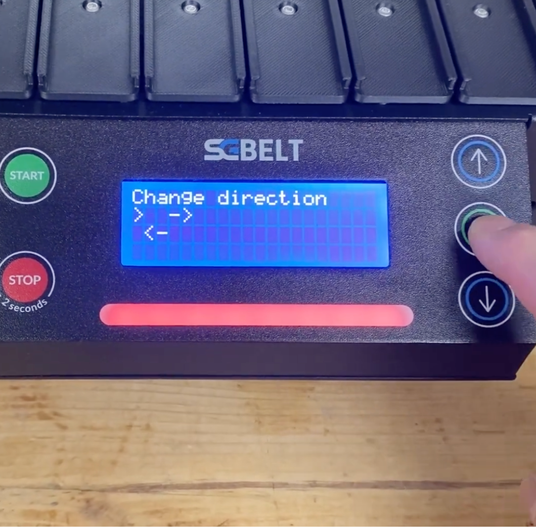 Najważniejsza i oczekiwana zmiana, którą wprowadziliśmy, to dodanie do podajnika opcji pracy dwukierunkowej. Pozwala ona na maksymalnie ergonomiczne ustawienie stanowiska pracy, zależnie od potrzeb, przyzwyczajeń, ustawienia lasera, bądź innych specyficznych potrzeb produkcji. Dodaliśmy w tym celu dodatkową opcję do menu podajnika, gdzie w prosty i intuicyjny sposób w dowolnym momencie możemy zmienić kierunek pracy podajnika do znakowania laserowego SGBELT.